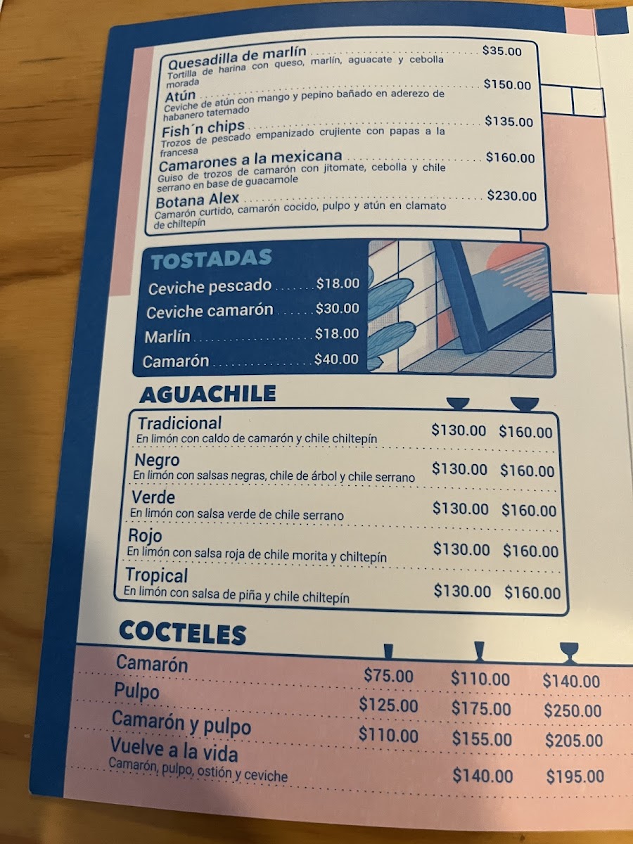 El lugar está bonito. Acudimos a las 5:20 aprox, el lugar dice que cierra a las 5 pm. Supongo que por eso ya no había pulpo, ni ostiones, ni aguachile :( entonces no pude probarlo. Al entrar no había nadie como tal recibiéndote, tu te sientas; nos tocó compartir una mesa con otra familia. Los precios son accesibles. La quesadilla de marlín no me encantó la combinación, pero estaba buena dentro de lo que cabe. La tostada de marlín 10/10, pídanla con mayonesa. El coctel también muy rico