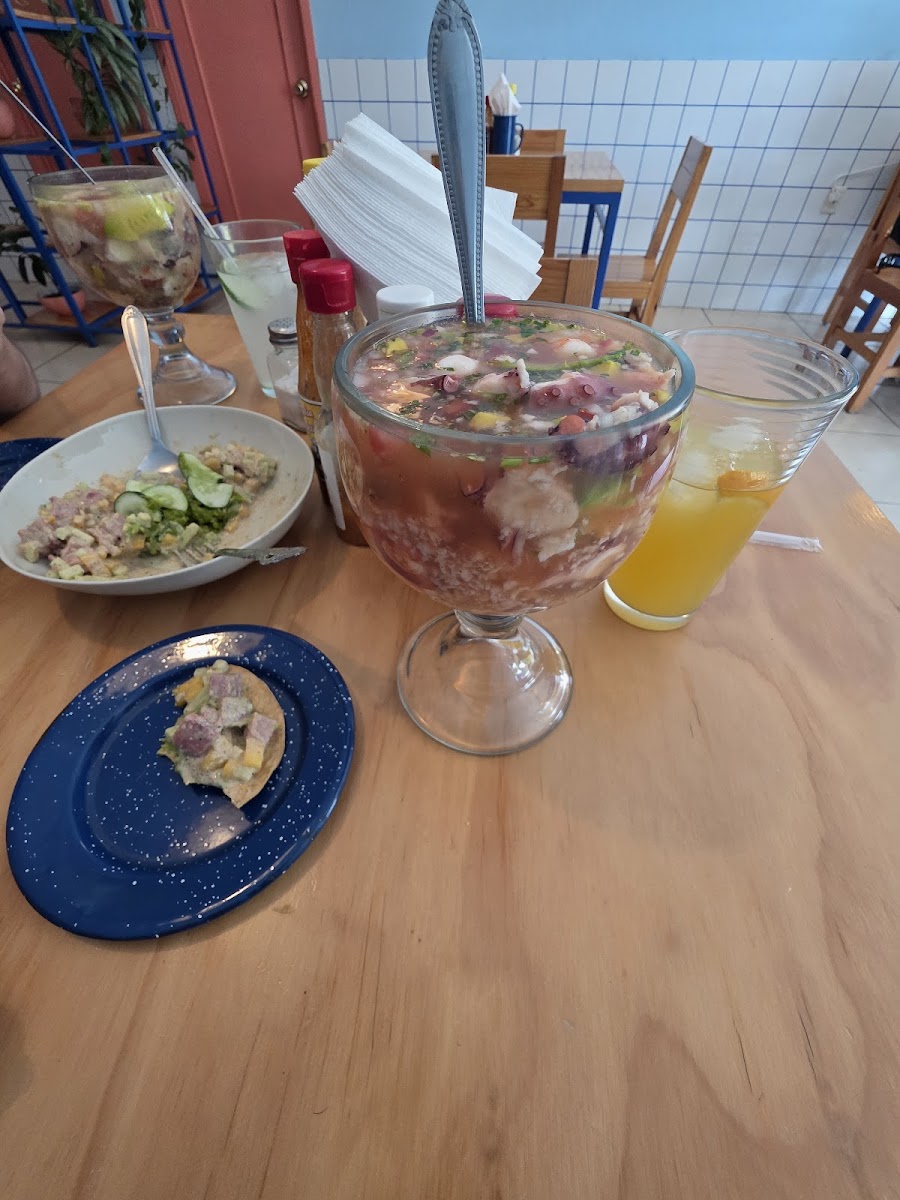 Buena experiencia la de comer ahí, lugar muy limpio, buena atención, cervezas y refrescos frios y a pesar de que estaba un poco lleno de personas no fue tanta la espera para que me llegara la comida, yo recomiendo mucho el coctel de camarón con pulpo tiene muy buen sabor, las tostadas de marly tambien muy sabrosas, tambien cuentan con variedad de aguachiles